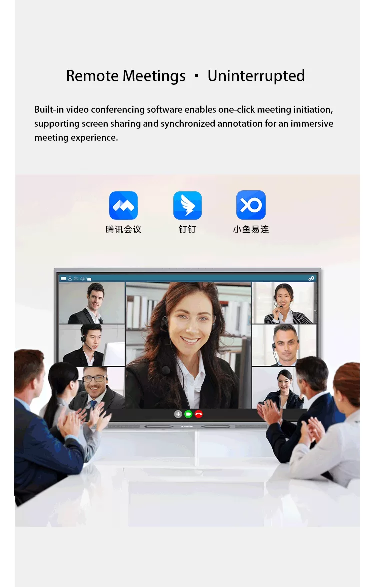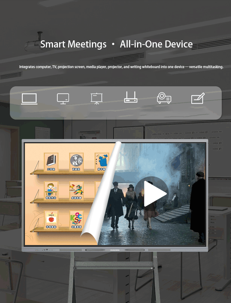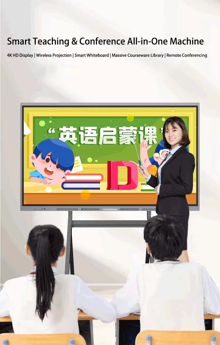 1. **Integrated Display:** Features a high-brightness, high-resolution panel (ranging from 32″ to 98″), eliminating the need for a separate projector. This ensures excellent image quality, even in well-lit rooms, with no shadows or glare.